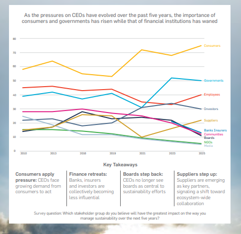 Corporate integration has expanded: 86% of companies have built environmental and social objectives into core operations, and 59% link management pay to sustainability metrics. However, only 25% of CEOs rank technology and innovation among their top business priorities, despite 97% identifying them as essential for performance and compliance.